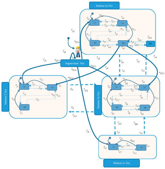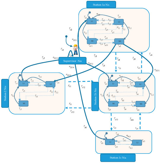 We are assuming that we are considering only one supervisor in our system. This supervisor must merge the several users who are operating their machines. The functions and responsibility of supervisor is that she/he must inform the users of their tasks initially. After that the supervisor will also play their role by modifying the product through different user and machine interactions and obtain information through the supervisor interface [27]. Therefore, the supervisor interface should be correct [28] and meaningful otherwise the outcome of product will not be as per the requirement of customer. We used the four-machine cell and operated by the four different users. At each cell we have states for operation for example in we have four states like wise represent the low having the same class while represent the medium having same class as shown in Figure 1. In between of these states we have transitions and these transitions are labelled as per our definitions. The dotted line represents the machine transitions while the dark line represents the user transition within the cell or if the transition is incoming or outgoing the cell then it termed as supervisor transition.