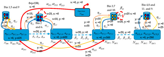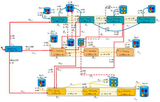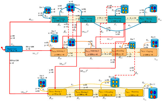 The supervisor will switch on the conveyor to transfer the part to its dedicated place and the parts will move from bin 6 to bin 2 and vice versa. Similarly, the parts move from bin 3 to bin 7 and bin 7 to bin 10. The user only places the part on to the conveyor and all the parts are moved through the conveyor which is controlled by the supervisor as per their company production plan. The dashed line is used for the machine transition and the dark lines represent the supervisor task as shown in Figure 8 and Figure 9. The supervisor machine events are = {, , , } and = {}. The procedure of iteration 2 is given in the Section 7 and their subsections.