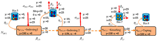 : Supervisor transmit the information to user 2 to perform the operations of indexing, knurling, and taping on EM1, EM2 and EM3 then few EM1 and EM2 parts move to bin 6 after indexing operation and few EM3 parts move to bin 7 after knurling operation. After performing the taping operation on EM1, EM2 and EM3 parts will move to bin 8.