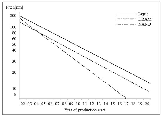Pitch change in the lithography process (2002–2020). DRAM, Dynamic Random-Access Memory; NAND, Negative-AND gate flash memory.