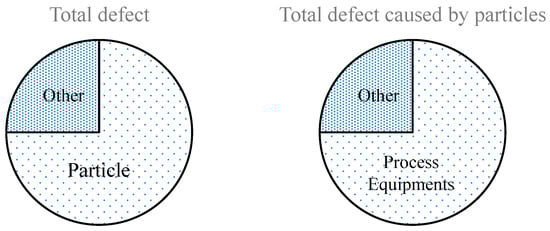 The defects in a semiconductor manufacturing process are generally distributed as shown in Figure 3. The pie chart on the left shows that the particle defects account for 75% of the total defects. As shown in the pie chart on the right, 75% of the particle defects are caused by process equipment [6].