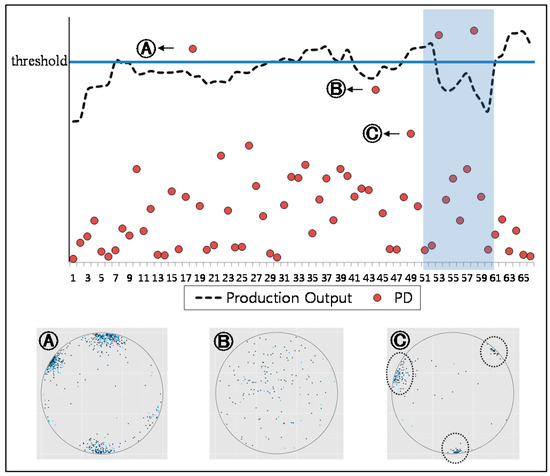 Figure 7 describes both the monitoring chart and the particle maps of the wafers required for observing the particles with specific equipment. In the monitoring chart, the horizontal axis is the wafer index and the vertical axis is the monitoring statistic, . The dashed-polygonal line indicates production yield and the solid straight line indicates the criterion that distinguishes between a non-defect and a defect. As shown in the chart, Wafer A is beyond the threshold, whereas Wafers B and C are within the threshold. Although both Wafers B and C are within the threshold, they have different distributions, as shown by their respective maps. The three wafer maps depict their respective particle distributions. Wafer A shows high-density particles because is beyond the threshold. The particles in Wafers B and C are differently distributed, whereas the monitoring chart indicates that is within the threshold for both wafers. The particles on Wafer B are uniformly distributed, and the particles on Wafer C are concentrated around the edges of the wafer. Consequently, despite a smaller , the particles concentrated on Wafer C can induce fatal risks, including out-of-threshold wafers or yield reductions, as shown by the shaded rectangular area of the plot. Therefore, since it is important to identify particle distributions, as in Wafer C, this study proposes a new monitoring method considering dense particles.