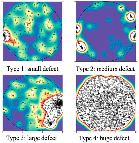 This section describes an experiment for verifying the proposed method and its results. The particle maps used for this experiment were retrieved from the etching process. As several “killer-particles” originate from the deposition of a layer of by-product on the inside of the plasma-etching chamber, the etching process is sensitive to particles [12]. Therefore, we used particle data from a real etching process in a Korean semiconductor manufacturing company, obtained over a period of five months. The entire dataset consists of 600 wafers, generating 600 particle maps. Among these particle maps, we defined the particle defect types using field knowledge. A dense particle indicates that the facility is abnormal. Therefore, the dataset with dense and even particles was selected. The four defect types are shown in Figure 10. Our dataset consists of 300 normal wafers, 100 wafers of Type 1, 100 wafers of Type 2, 50 wafers of Type 3, and 50 wafers of Type 4. These types were determined by experienced engineers.