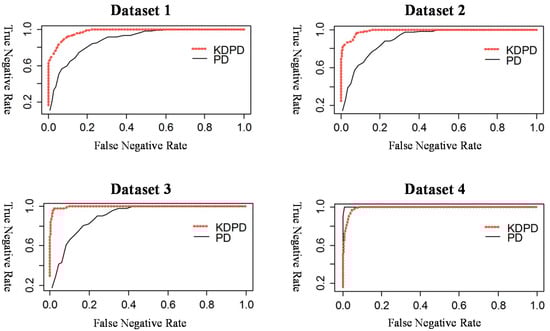 We used the monitoring method illustrated in Figure 7 to classify non-defect and defect particle maps. The threshold in the monitoring chart corresponds to the upper control limit (UCL) in the statistical process control chart. Therefore, we compared the classification performance of the particle defect map by adjusting the decision threshold of the defect/non-defect. Further, we used the receiver operating characteristic (ROC) curve, a graphical plot that illustrates the performance of a binary classification. Moreover, in order to compare these curves, the area under the ROC (AUROC) curve was considered [13]. A broader AUROC can detect a particle defect more accurately. As defect classification is more important than non-defect classification, the ROC curve uses a false negative rate for the X-axis and a true negative rate for the Y-axis. Figure 11 depicts the ROC curves for both and of the four datasets defined in Table 1, and the AUROC examines the monitoring performances.