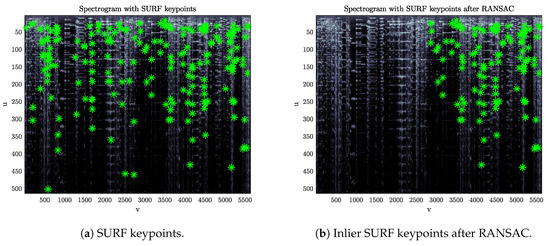 - From two sets of keypoints , find a subset of matched pairs by comparing the related descriptors. Given the matched pairs , estimate the optimum geometric transform mapping onto with the RANSAC algorithm [36]. If a leader-tape is present, the set of inlier points returned by the algorithm will converge to a subset of keypoints belonging to only one of the two portions of the spectrogram separated by the leader (Figure 3).