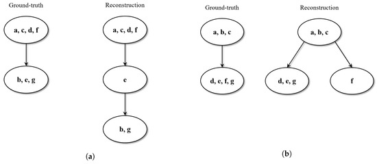 Figure 5. Examples of tree reconstruction with over-clustering errors. Datasets consist of seven audio tracks, . In (a), cluster is split into the parent-child pair ; in (b), cluster is split into the sibling pair . - In 10% of the cases, the estimated tree shows some wrong phylogenetic relations (ancestor-descendant swaps) with respect to the ground-truth.