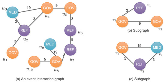 For example, Figure 1a illustrates a labelled graph of event interaction graph. Node labels represent the event actor’s type (e.g., GOV: government) in CAMEO (Conflict And Mediation Event Observations) codes [28] and edge labels represent the event type [28] between the two actors. Figure 1b,c shows two subgraphs of Figure 1a. Figure 1b () has three isomorphisms with respect to graph (a): , and .