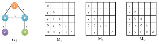 Figure 3 shows three adjacency matrices , , for the graph on the left. After applying the standard lexicographic order, we have . In fact, is the canonical adjacency matrix of .