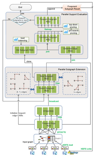 Figure 4 illustrates the proposed framework of our SSiGraM approach. It mainly contains two major components: parallel subgraph extension and parallel support evaluation. The green notations are main Spark RDD (a resilient distributed dataset (RDD) is the core abstraction of Spark, which is a fault-tolerant collection of elements that can be operated on in parallel) transformations or actions used during the algorithm pipeline, e.g., map, join, etc. We will discuss details of the framework below.