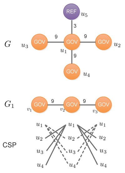 Theorem 2 [12] describes the relation between subgraph isomorphism and the CSP model. Intuitively, the CSP model is similar to a template, in which each variable in is a slot. A solution is a correct slot fitting which assigns a different node of G to each node of , such that the labels of the corresponding nodes and edges match. For instance, a solution to the CSP of the above example is the assignment . If there exists a solution that assigns a node u to variable , then this assignment is valid. is a valid assignment while is invalid in this example.
