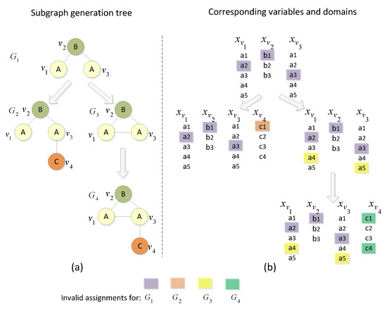 Either FFSM-Join operation or FFSM-Extend operation add an edge to the parent subgraph at a time when generating new subgraphs and constructing the suboptimal CAM tree. Therefore, as the parent subgraph at upside of suboptimal CAM tree is a substructure of its child subgraph, those assignments that were pruned from the domains of the parent, can also not be valid assignments for any of its children [12]. For instance, Figure 6a shows a part of a subgraph generation tree, which is constructed from which is extended to and and last, via . The marked nodes in different colors represent the pruned assignments from the top to bottom. Invalid assignments from parent subgraphs are pruned from all their child subgraphs. Thus, the search space is reduced a lot. Take subgraph in Figure 6 as an example, when considering variable , the search space has a size of combinations, while without top-down pruning the respective search space size is combinations.