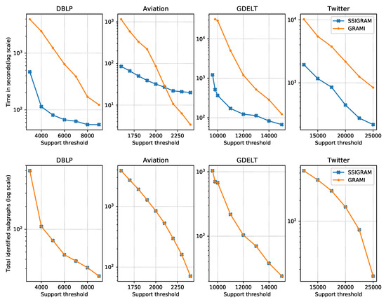 Performance: At the top part of Figure 7, we show the performance comparison between SSiGraM and GraMi on DBLP, Aviation, GDELT and Twitter datasets. The number of results grows exponentially when the support threshold decreases. Thus, the running time of all algorithms also grows exponentially. Our results indicate that SSiGraM outperforms GraMi by an order of magnitude for all datasets. For bigger dataset GDELT and lower (9600), GraMi ran out of memory and was not able to produce a result. For smaller dataset Aviation and bigger (2200, 2300 and 2400), GraMi is faster because the resource scheduling of Hadoop YARN in SSiGraM will cost 10 to 20 s. Actually, in this circumstance, there is no need to use parallel mining algorithms since GraMi can give results within a few seconds. For the Twitter dataset, SSiGraM is about five times faster than GraMi because of the existence of nodes with a big degree. When a subgraph involves such a node, SSiGraM will not go to the next iteration until the executor finishes calculating the support of this subgraph.