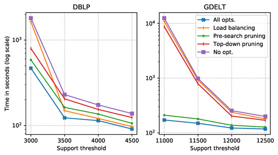 Optimization: Figure 8 demonstrates the effect of the three optimizations discussed above on the DBLP and GDELT datasets. For both datasets, the SSiGraM with all optimizations (denoted by All opts. in Figure 8) definitely performs best. For the DBLP dataset, when , load balancing is the most effective optimization while as becomes bigger, pre-search pruning becomes the most effective. For the GDELT dataset, the pre-pruning is always the most effective optimization. When no optimization is involved (denoted by No opt. in Figure 8), the algorithm performs worst. Actually, the effect of each optimization strategy varies with input graphs and different thresholds.
