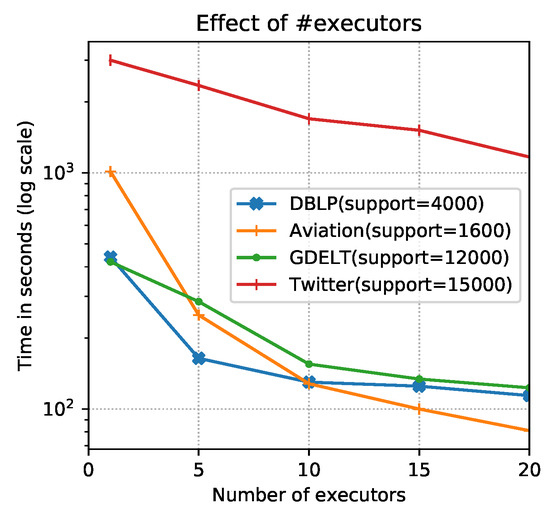 Parallelism: Finally, to evaluate the effect of the number of executors, we fix the supports of each dataset and vary the num-executor parameter of the Spark configuration file. According to the principle of the same allocated memory from YARN, we set num-executors to 20, 15, 10, 5 and 1 with executor-memory being 6 GB, 8 GB, 12 GB, 24 GB and 120 GB respectively. The results shown in Figure 9 lead to three major observations. First, compared with GraMi’s performance shown in Figure 7, the proposed algorithm outperforms the GraMi algorithm even when only one executor was used. This is because the complexity of SSGraMi is less than that of GraMi ( ), especially when n is large. Second, the runtime decreases with the increment of parallelism for each dataset overall. Third, when the num-executor is bigger than 10, the performance improvement is less obvious because the final performance will be dependent on a few time-consuming subgraphs. Thus, most executors will wait until these subgraphs are finished. More executors cannot avoid this phenomenon.