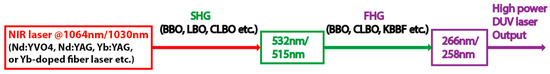 In the past decades, with the fast development of the solid-state lasers and the nonlinear optical crystals, high-power DUV lasers at 266 nm/258 nm have been studied by many research groups fruitfully [3,4,5,6,7,8,9,10,11,12,13,14,15,16,17]. These DUV lasers are usually generated by fourth-harmonics generation (FHG) of the near-infrared (NIR) laser at 1 μm as shown in Figure 1. Until now, the highest average output power of these DUV lasers was 40 W at the wavelength of 266 nm, of which the fundamental light was a high-power Nd:Y3Al5O12(Nd:YAG) laser at 1064 nm and the nonlinear optical crystal was a CsLiB6O10 (CLBO) [8]. In the scientific and industrial applications, the beam quality of the DUV laser is also an important parameter. Particularly, the beam quality of the DUV laser dramatically affects the laser machining results. The beam quality of the DUV laser is determined by that of the fundamental laser and the crystal for the frequency conversion. Recently, a high-power DUV laser (>10 W) at 258 nm was reported with a beam quality of M2 < 1.5, which was generated by FHG of a Yb:YAG laser at 1030 nm using the CLBO crystal [13]. This laser would lead to a better laser machining result compared to the previous DUV lasers with larger M2.