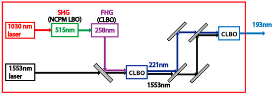 Recently, 310 mW DUV laser at 193 nm was generated by stages of SFG in the CLBO crystals. The schematic setup for this 193 nm laser was shown in Figure 2. The 193-nm laser was generated by two stages of SFG process between a 258 nm laser generated by FHG of a 1030 nm laser and a 1553 nm laser. The 1030 nm laser was based on an Yb-doped hybrid amplifier and the 1553 nm laser was from an Er-doped fiber amplifier. The 1030 nm laser and the 1553 nm laser were synchronized by a commercial available delay/digital pulse generator. The LBO crystal was utilized for the SHG to 515 nm and the CLBO crystals were used for FHG to 258 nm, SFG to 221 nm, and SFG to 193 nm. The generated 193 nm laser was operated at 6 kHz with pulse duration of 4 ns. The average power was 310 mW and the linewidth was about 4 GHz, which satisfied the needs for injection-seeding the hybrid ArF excimer laser [2,12]. As a higher-power 193 nm laser was needed to increase the signal-to-ASE-ratio of the hybrid ArF excimer laser output, a watt-level 193-nm laser has been generated due to this requirement [20].