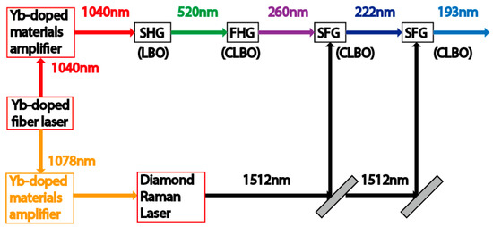 - Xuan, H.; Zhao, Z.; Igarashi, H.; Ito, S.; Kakizaki, K.; Kobayashi, Y. 300-mW narrow-linewidth deep-ultraviolet light generation at 193 nm by frequency mixing between Yb-hybrid and Er-fiber lasers. Opt. Express 2015, 23, 10564–10572. [Google Scholar] [CrossRef] [PubMed]