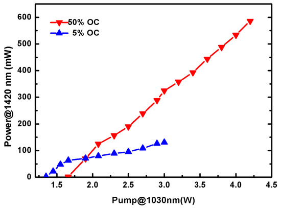 The Raman laser achieved lasing at the wavelength of 1420 nm when the pump laser power was above the threshold power. As shown in Figure 5, the threshold power was 1.25 W and 1.5 W for the 5% and 50% OC, respectively. The threshold power for 20% OC was between 1.25 W and 1.5 W. During the cavity alignment to achieve the 2nd Stokes wavelength, the AR coating of the front surface of the diamond was easily damaged by the reflected pump beam back from the OC when the pump laser (1030 nm) power was higher than 3 W. This was because of the imperfect design of the current Raman laser cavity. Not only the AR coating of the diamond surface but also the coating of the input mirror M1 was damaged by the returned pump laser. The values of the intensity of the returned pump laser at M1 and the front surface of the diamond were estimated to be 0.6–1 J/cm2. The pump power was limited to 3 W to prevent the damages inside cavity for 5% and 20% OC. For the 50% OC, the pump power was carefully increased to about 4 W during the experiment, which was still at a lower power level in order to avoid the damage of the M1 and diamond. The HT coating of the pump beam at OC or the change of the radius of the curvature of could solve this issue to realize the higher power operation. At the pump power of 3 W, the output power of the Raman laser was 130 mW, 293 mW and 325 mW using 5%, 20%, and 50% OC, respectively. By use of the 50% OC, the highest average power of this Raman laser was 0.586 W when the pump laser was 4.2 W as shown in Figure 5, with the slope efficiency of 23% which was comparable to the previous reported results. The spectrum of the generated 2nd Stokes after the two reflection mirrors was measured by a spectrometer (NIRQuest512, Ocean Optics Inc., Largo, FL, USA) as shown in Figure 6.