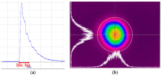 The pulse duration of the second Stokes light was shortened to 5 ns as shown in Figure 7a, a single-shot picture from the oscilloscope, which is a common phenomenon in Raman laser [44] while the pulse duration of the pump laser was 10 ns. The beam profile shown in Figure 7b demonstrated a good beam quality as one of the merits of Raman laser, which would be beneficial to generate a 193-nm DUV laser with a high quality beam.