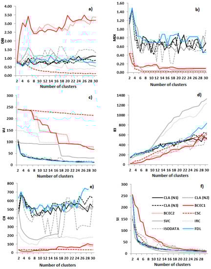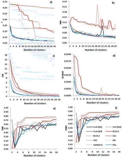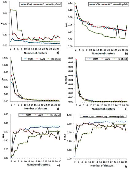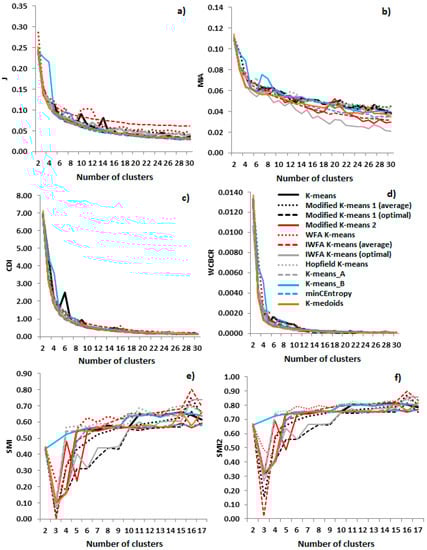 The 2nd type of papers includes a comparison among algorithms in order to define the most suitable algorithm for a specific data set. Early analyses are found in References [,,]. In Reference [], the comparison includes two versions of hierarchical agglomerative clustering, namely, Ward and average linkage, FCM, K-means FDL and SOM. The comparison is held via 4 adequacy measures, namely the Mean Index Adequacy (MIA), Similarity Matrix Indicator (SMI), Clustering Dispersion Indicator (CDI) and Davies-Bouldin Index (DBI). The algorithms are executed for 10 to 20 clusters. According to MIA and CDI, the FDL wins the competition but SMI and DBI indicate that the superior algorithm is the K-means. In [], the hierarchical clustering and FCM are compared only in terms of the shapes of the load profiles that lead to. It should be noted, that an algorithm is more efficient than the others only for specific number of clusters. This is evident in []. Utilizing the CDI, the FDL leads to lower errors for large number of clusters (i.e., above 22) while average linkage hierarchical clustering is more efficient for small number. The analysis of [] is enriched in [] by adding 2 measures, namely the Scatter Index (SI) and the Variance Ratio Criterion (VRC). Again, the extraction of the optimal algorithm is a matter of the selection of the validity indicator. In order to address the problem of the strong dependence of the K-means in the selection of initial centroids, 2 modified versions of the algorithm have been proposed in [,,]. The modified versions seek to extract the optimal combination of 2 calibrated parameters that define the initial cluster centroids. With this approach, the initial centroids of the K-means are chosen based on the best results of each one of 6 adequacy measures. The proposed versions of the K-means present better performance when compared with the FCM, the family of hierarchical algorithms, 1D and 2D SOM and the adaptive learning quantization algorithm.