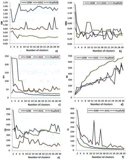 The artificial neural networks used in clustering are based on the concept of competitive learning or on energy function minimization. The latter is employed in Hopfield Neural network, which is a recurrent neural network with full weight connection among the neurons [,]. When an input is presented in the network, the weights are re-arranged in order to reach the minimum energy state. The weights represent the distances between patterns and centroids. The competitive learning operates differently. The competition refers to the neurons response to the input pattern. The neurons have the capability of affecting positively or negatively, or even not affecting at all, the other neurons. The neuron that wins the competition has the highest activation value. The weight update is held in a way that includes the addition of the input vector. The neural network that is based on the Adaptive Vector Quantization (AVQ) algorithm is composed by an input layer and an output layer []. A D-dimensional input is presented in the input layer. The winning neural is activated by receiving the value “1” while the rest receive the value “0” []. The weight update of the winning neuron k at iteration t is given by: