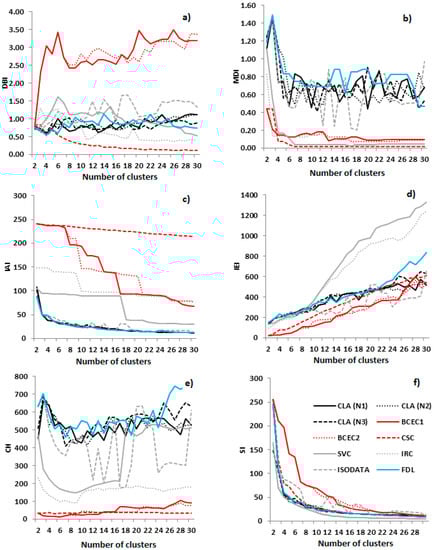 The performance of a clustering algorithm is checked either with qualitative or quantitative criteria [,]. In the qualitative assessment, different algorithms are compared based on the shapes of the generated load profiles and the clustering compositions, i.e., the number of patterns that belong to each cluster. This assessment does not rely on mathematical objective criteria and is a minority in the literature. The quantitative assessment is based on the scores of the algorithm in a set of adequacy measures or clustering validity indicators. These indicators are built upon the Euclidean distance metric and evaluate the capacity of an algorithm to formulate well-separated and compact clusters. This assessment approach is the most common in the literature. However, while a clustering validity indicator provides a strong mathematical basis to build upon the conclusions derived from load profiling, the process of the evaluation of an algorithm is actually validity indicator specific. This means that the selection of an indicator influences the conclusions. For instance, a comparison of the algorithms with 2 different indicators can lead to different algorithms ranking. In order to deal with this issue, the present paper presents a set of 5 overarching criteria that can assess the complexity of an algorithm, its capacity per application and availability. These criteria are the following: