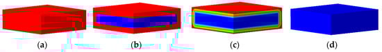 Material distribution in the models; (a) homogeneous material property distribution of durable concrete; (b) zoned material property distribution; (c) gradient material property distribution; (d) homogeneous material property distribution of hydration energy optimized concrete.