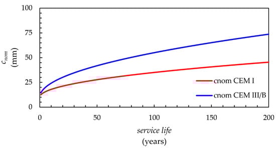 According to [4,5,6] the performance-based resistance to carbonation is highly dependent on the cement type. Cement CEM I (high hydration energy) has good carbonation resistance while CEM III (low hydration energy) has a poor one. The nominal concrete cover of a structure with a service life of 150 years made of concrete with w/c ratio = 0.5 varies from 40 mm if CEM I is used to 65 mm if CEM III/B is used, as can be seen in Figure 4. The curves are calculated assuming a carbonation rate for CEM I of kNAC = 2.5 mm/year0.5 and a carbonation rate for CEM III/B of kNAC = 4.5 mm/year0.5. Additionally, an execution tolerance of Δc = 10 mm, according to [4,5,6] and standard test conditions (ke = ka = kc = W(t) = 1) for carbonation rate were assumed. The following equation (10) was used: