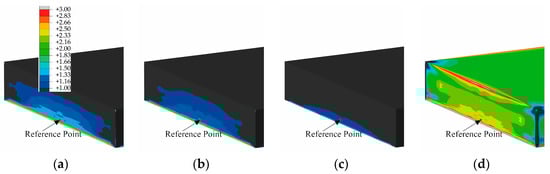 Distribution of maximum crack index (Icr) at a side (mirrored quarter model) for (a) homogeneous durability optimized material distribution; (b) zoned material property distribution; (c) gradient material property distribution and (d) homogeneous hydration energy optimized concrete.