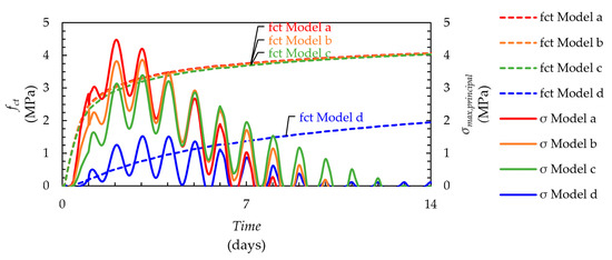 Time development of the tensile strength (fct) and maximum tensile stress (σmax,principal) at the reference point (see Figure 6) for (a) homogeneous durability optimized material distribution; (b) zoned material property distribution; (c) gradient material property distribution and (d) homogeneous hydration energy optimized concrete.