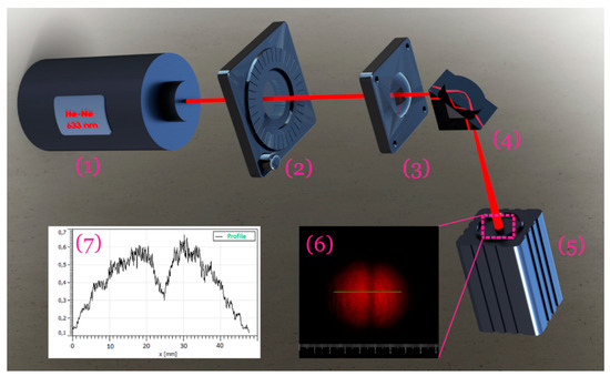 Schematic of an experimental equipment (1–5), color photograph of the reflected light spot (6) and intensity profile (7) measured at a distance of 405 cm. 1- He-Ne laser, 2-polarizer, 3-lens, 4-investigated structure SiO2/(HL)19/Al2O3/ZnS(1)/Ag/ZnS(2)/air glued to silica prism via a droplet of phase-matching oil, 5-CMOS (complementary metal-oxide semiconductor) camera.