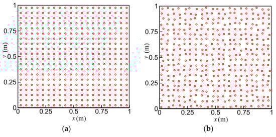 The computational domain of the test is chosen as a square with the side length of 1 m as shown in Figure 1. The test function uses a polynomial of second-order expressed by . The SPH kernel function used is a cubic spline kernel [5] normalized in 2D. The SPH particles are arranged in a uniform and non-uniform configuration, respectively. In the former case a uniform Cartesian configuration of the particles is used, while in the latter case the particle positions are determined by , where is a random number with a value (0, 1) through the quasi-random number generator, and is the particle size vector in 2D under the uniform distribution condition. A sample particle distribution is also illustrated in Figure 1 for the particle number of 400. In the following test, five different particle resolutions are considered, including a total number of 20 × 20, 40 × 40, 60 × 60, 80 × 80, 100 × 100 particles. This corresponds to the particle size of = 0.05 m, 0.025 m, 0.01667 m, 0.0125 m and 0.01 m, respectively.