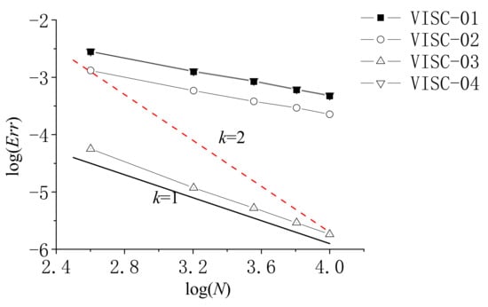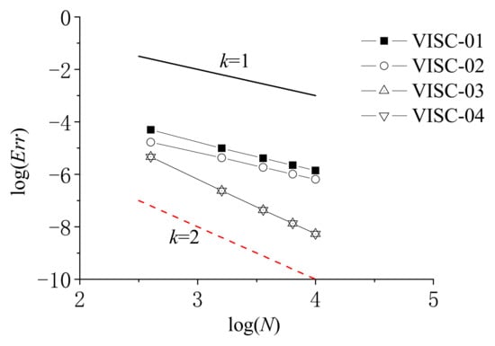 Furthermore, Table 2 gives the mean errors for the different particle numbers computed by the different viscosity methods, and Figure 5 gives the convergence rate corresponding to the particle number and error , under the non-uniform particle configurations. From Table 2, the results of VISC-03 show the best accuracy, while VISC-01 and VISC-04 results demonstrate the least satisfactory performance. In comparison, VISC-02 results are in the middle range. Also, it can be found that the errors of VISC-04 change a lot with the different particle numbers. Besides, Figure 5 quantitatively shows that the convergence rate of VISC-03 is near the first-order accuracy, while the other three models cannot reach this level of the convergence. Similar results are also observed on VISC-01 and VISC-04.