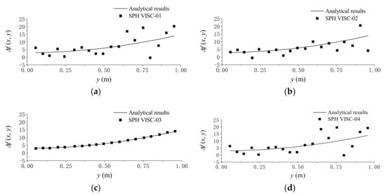 To examine the second-order derivative of the polynomial function, i.e., , Figure 2 gives the comparisons between the analytical and numerical results computed by the different SPH viscosity force models, at = 0.5 m and = (0, 1) m, under uniform particle distribution with a particle size = 0.05 m. As shown in Figure 2, all the four viscosity methods led to a very good agreement with the analytical results when the particles are uniformly distributed.