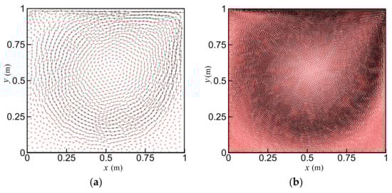 Vector plots of lid-driven flow for the two different particle numbers: (a) N = 1600; and (b) N = 10,000. Red, location of fluid particle; Black, velocity of flow field.