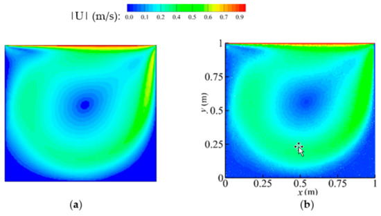 Velocity amplitude patterns of the lid-driven flow computed by (a) OpenFOAM; and (b) ISPH (VISC-04).