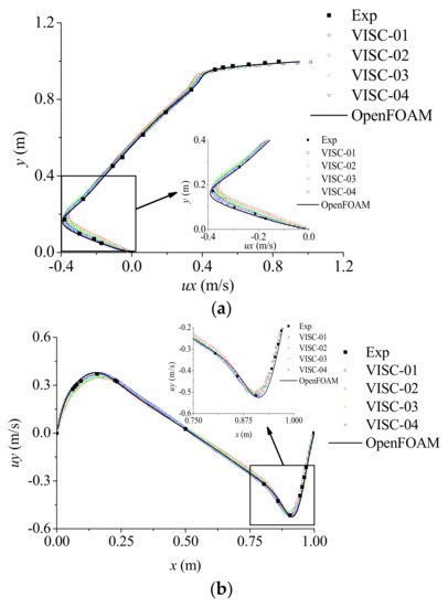 Comparisons of four viscosity force models for the lid-driven flow: (a) ux velocity distribution; and (b) uy velocity distribution. OpenFOAM, Open source Field Operation and Manipulation; Exp, Experimental data of Ghia et al.