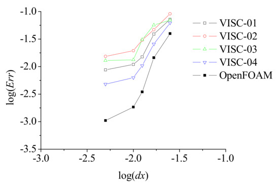 Furthermore, for the purpose of model convergence analysis, Figure 10 gives the errors in minimum ux value between the experimental data and various ISPH results for the different particle resolutions. The computational results of OpenFOAM are also shown for a comparison. The numerical error is defined by =, where is the numerical minimum and is the experimental one. According to the results in Figure 10, all errors obtained by the ISPH viscosity force models unanimously show a decreasing trend with a decrease in the particle size, i.e., an increase in the particle number. Meanwhile, VISC-04 can achieve the smallest errors among all viscosity force models under the same particle scale.