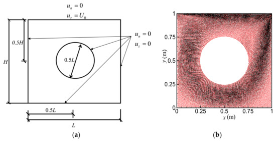 To provide a further robust evaluation on the proposed ISPH viscosity force models, this section explores a more complex lid-driven flow case with a cylinder inside. The schematic set up of the model is shown in Figure 11a. There is a cylinder inside the cavity region, with its diameter being d = 0.5 L. The 2D square cavity has a height H and width L, with the dimensions of H = L = 1.0 m. The center of the cylinder is located at (0.5 L, 0.5 H). The wall boundary of both the cylinder and the cavity region is set as the non-slip and non-penetration condition in the tangential and normal directions, respectively, where ur and un indicate the velocity component in each direction. The velocity of the top wall of the cavity in the x-direction is given by U0 = 1.0 m/s, which leads to a Reynolds number Re = 1000. The other computational parameters are kept unchanged as those used in Section 5.1. Based on the ISPH model simulations (with VISC-04), Figure 11b gives the result of velocity vector plots of the cavity flow at particle number N = 10,000 and simulation time t = 40 s, when the steady results are achieved. Figure 12 shows the comparison of velocity amplitude patterns between the ISPH and OpenFOAM computations, and a qualitatively good agreement has been found.