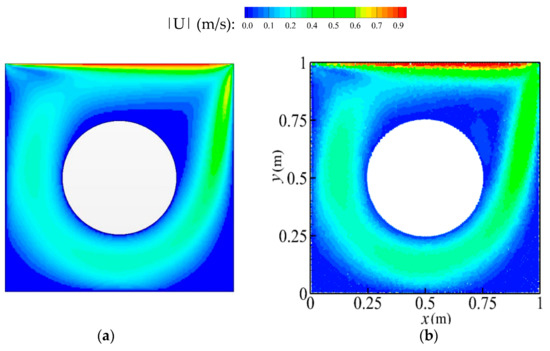 Velocity amplitude patterns of the lid-driven flow with an inside cylinder computed by: (a) OpenFOAM; and (b) ISPH (VISC-04).