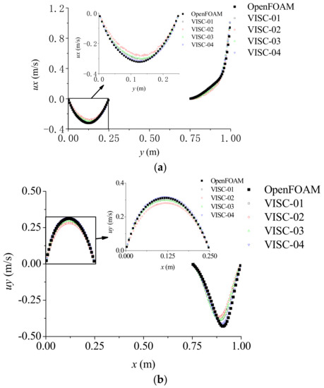 In order to quantify the accuracy of different viscosity calculation methods, Figure 9 gives the comparisons of velocity component distributions ux at x = 0.5 m and uy at y = 0.5 m with the experimental data of Ghia et al. [43] and OpenFOAM. In this case, the following computational parameters are used: particle size dx = 0.005 m, simulation time t = 40 s and Reynolds number Re = 1000. It is shown from Figure 9 that the results obtained by the four viscosity calculation methods are generally quite similar to each other. By examining the enlarged chart where the velocity experiences a larger gradient, however, it can be found that the results obtained by VISC-04 can get the best agreement with the experimental data.