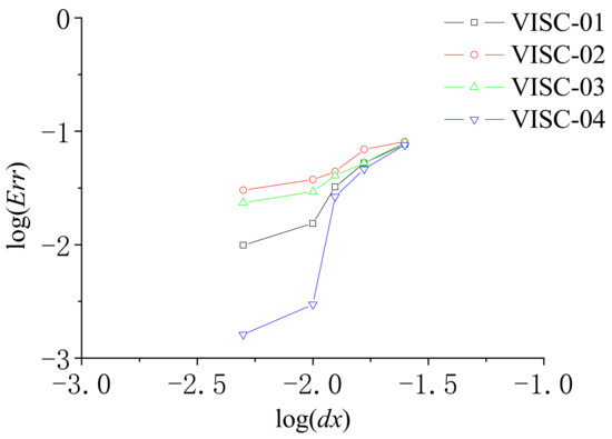 For convergence and error analysis, Figure 14 gives the numerical errors of minimum velocity ux of various ISPH viscosity force models under different particle resolutions, where Err is defined as the same error used in the previous section. Again all the ISPH errors decrease with the deceasing particle size. In addition, it is also disclosed that the error of VISC-04 is the smallest, which is consistent with the conclusion drawn from Section 5.1.