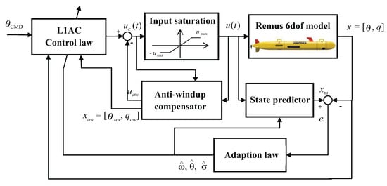 - Maalouf, D.; Creuze, V.; Chemori, A. A novel application of multivariable L1 adaptive control: From design to real-time implementation on an underwater vehicle. In Proceedings of the 2012 IEEE/RSJ International Conference on Intelligent Robots and Systems(IROS), Vilamoura-Algarve, Portugal, 7–11 October 2012; pp. 76–81. [Google Scholar]