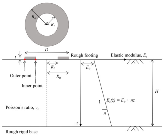 This study has considered ring footings placed on a layered system in which an elastic layer of finite thickness overlying a rigid rough base, as illustrated schematically in Figure 1. The ring footing is specified with inner and outer radii Ri and R0, respectively. In this study, five inner-to-outer radius ratios (Ri/R0 = 0, 0.2, 0.4, 0.6, and 0.8) are investigated, which covers most problems of practical interest [17]. The footing roughness is assumed to be perfectly rough, which does not permit any relative movement at all along the soil-footing interface. A similar assumption was used in the literature [18] for elastic settlement of shallow footings. The soil is modeled as an isotropic inhomogeneous continuum which obeys Hooke’s law. The soil deformation is represented by two parameters, i.e., elastic modulus Es and Poisson’s ratio νs. The Es was idealized as varying linearly with depth: