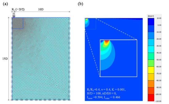 Small-displacement finite element analyses were conducted using the commercial software PLAXIS 2D version 2012 [22]. The finite element model consisted of two parts: the footing and the soil. The footing was modeled with six-node triangular plate elements, and the soil was modeled with fifteen-node triangular elements. Owing to an axisymmetric distribution of the stress about a vertical line passing through the center of the footing, only one half of the total domain is employed (Figure 2a). A full fixity was set at the base of the soil domain and roller conditions at the sides. The soil domain was chosen as 10D in diameter and 15D in depth. A fine mesh was created in the region adjacent to the footing to obtain precise calculations; the distribution and concentration of the elements depend on the geometrical parameters considered. The footing was simulated as a non-porous linear elastic material with 1 m thickness and elastic modulus for concrete Ec = 30 GPa. The outer radius of the ring footing was kept constant at 5 m and other parameters were varied for the systematic exploration. The interface of the footing was rough and fully attached to the soil. A uniform stress was applied to weightless footings with different configurations and stiffnesses to determine the corresponding settlements. The elastic settlement of ring footings is obtained from a series of numerical analyses, and the settlement influence factor is calculated using Equation (1). It is noted that, for brevity, only settlement results were taken into account, although the contact pressure distribution, stress distribution in soil medium and bending moment variation in footing are readily available from this analysis (Figure 2b).