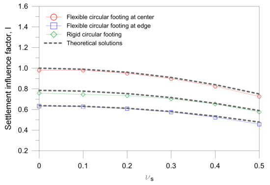 where D is the footing diameter and νs is the Poisson’s ratio of the soil. For a flexible circular footing, I is equal to 1 and 2/π for the center and edge points, respectively, and 0.85 for the average settlement [10]. For a rigid circular footing, I is equal to π/4 [16].