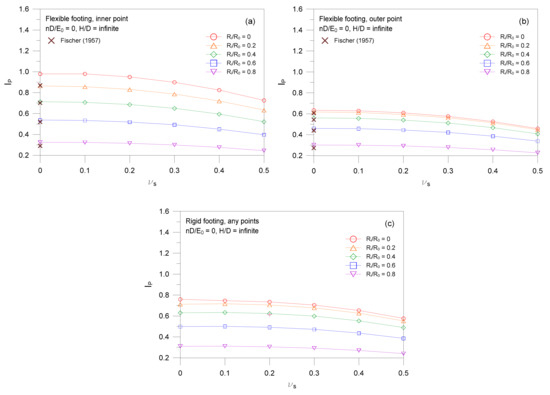 Figure 4 shows the variation of the settlement influence factor IP of perfectly flexible and rigid ring footings on a homogeneous elastic half-space for different combinations of νs and Ri/R0. It can be seen that an increase in Poisson’s ratio leads to a decrease in IP, regardless of footing stiffness. However, the effect of the Poisson’s ratio on the results is independent of Ri/R0. Figure 4 also provides a comparison of the IP values obtained in this study with the theoretical solutions of Fischer [9] for flexible ring footings on incompressible elastic medium. It can be observed that the present solutions compare reasonably well with the results of Fischer [9]. Meanwhile, it should be noted that the contribution of Poisson’s ratio to the settlement of ring footings can be reflected by the product of a correction factor (1 − νs2) and a value of IK for νs = 0.