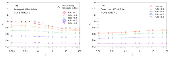 Figure 5 highlights the effects of K and Ri/R0 on the settlement influence factor IK of ring footings on a homogeneous elastic half-space. It can be seen that at the inner point of the footing (Figure 5a), the IK values decrease with increasing the values of K, implying that the higher footing stiffness reduces the inner settlement of the footing. At the outer point of the footing (Figure 5b), the IK values increase with increasing values of K; that is, higher footing stiffness causes a larger outer settlement of the footing. It can be also noticed that for smaller values of Ri/R0, the change in IK with respect to the footing stiffness is significant, irrespective of the point studied. Meanwhile, the values of IK for the circular footing were compared with those obtained by Brown [20] using integral transform technique. As shown in Figure 5a, the present IK values are found to be invariably lower than the solutions of Brown [20]. This result is unsurprising, given the different footing roughnesses (i.e., rough and smooth roughnesses) for which current and Brown’s analyses were adopted, so they are not directly comparable.