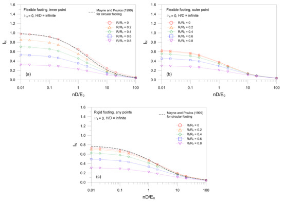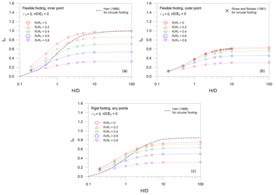 Figure 4, Figure 5, Figure 6, Figure 7 and Figure 8 show the numerical solutions for uniformly loaded ring footings, as related to inner-to-outer radius ratio Ri/R0, Poisson’s ratio νs, footing stiffness K, finite layer thickness ratio H/D, and modulus inhomogeneity nD/E0. The results are presented in the familiar form of the settlement influence factors at the points investigated: in the perfectly flexible footing case (K = 0.001), the influence charts for the inner and outer settlement of a footing are given; in the perfectly rigid footing case (K = 100), the influence charts for inner settlement (representing any settlement beneath the footing) are provided. This is because a flexible footing imposes non-uniform settlement but a rigid footing induces uniform settlement.