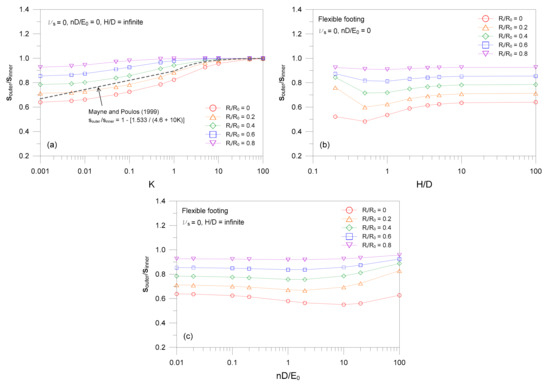Variation of souter/sinner with respect to footing stiffness, finite layer thickness ratio and modulus inhomogeneity: (a) effect of K; (b) effect of H/D; (c) effect of nD/E0.